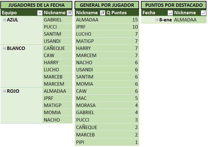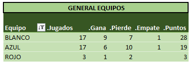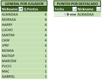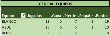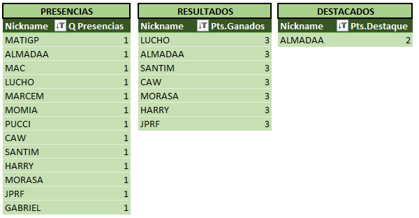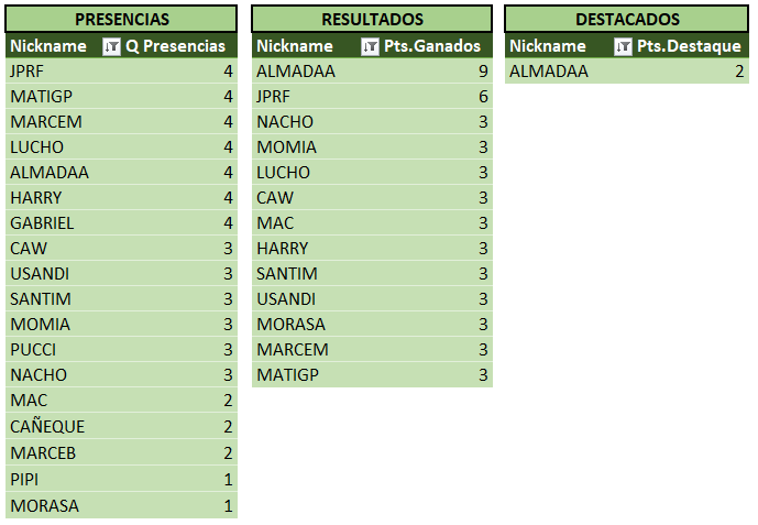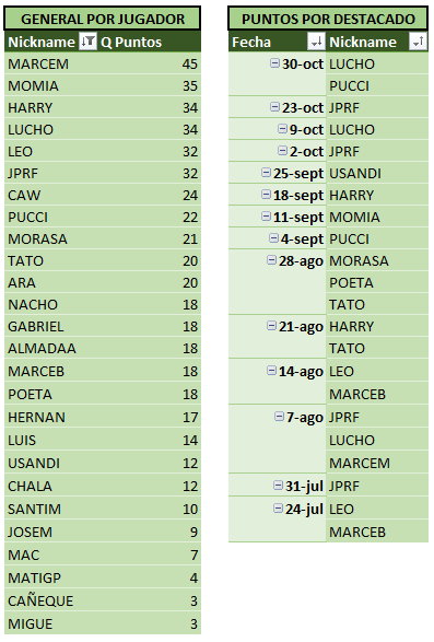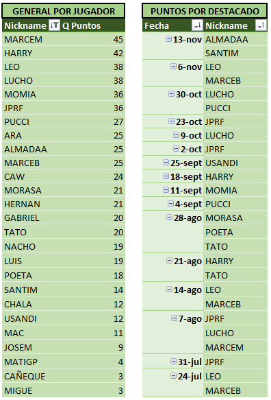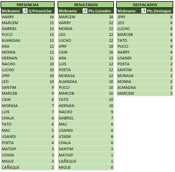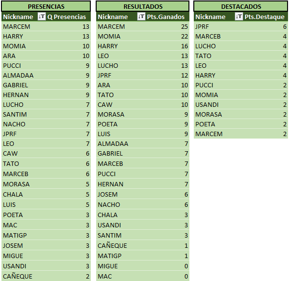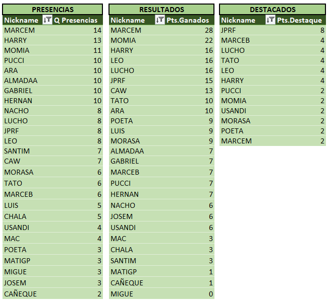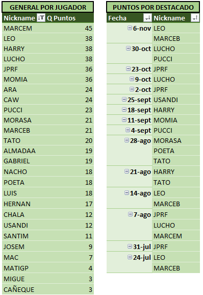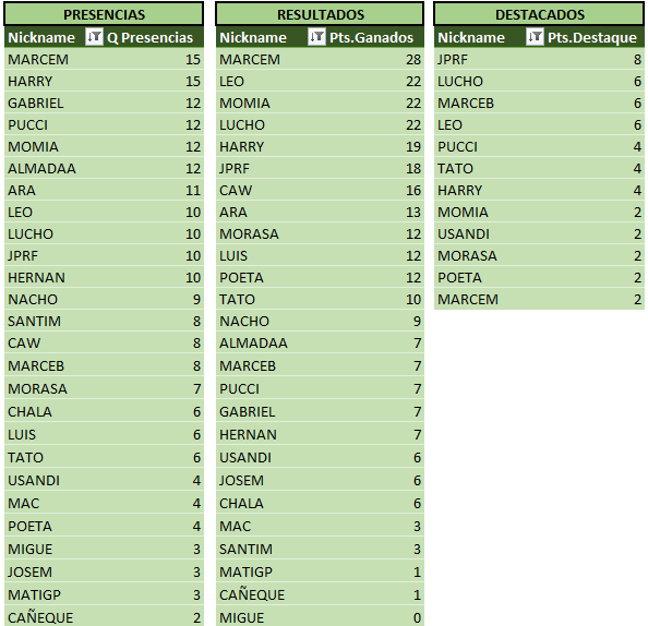 Sin otra información para agregar a la crónica, a continuación las tablas actualizadas, donde podemos ver a MARCEM encabezando las tablas!! Se acerca el fin del torneo, y se hace cada vez más dificil alcanzarlo…