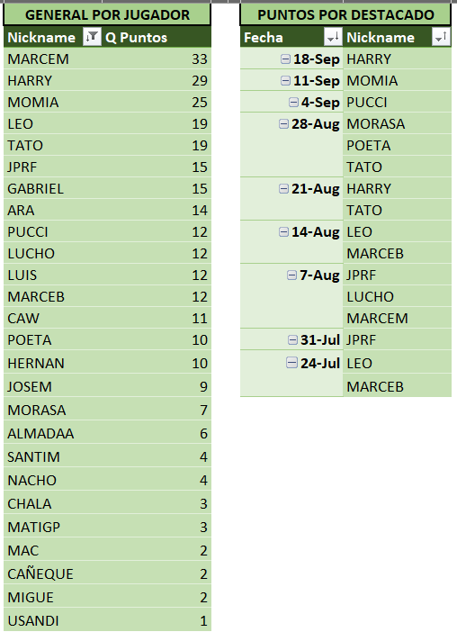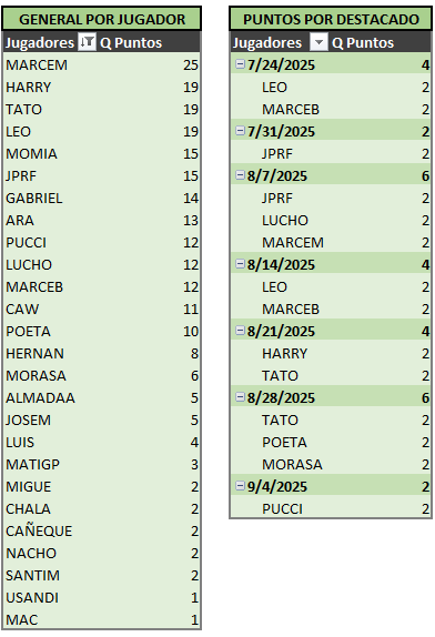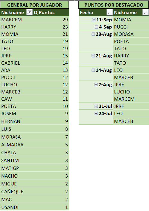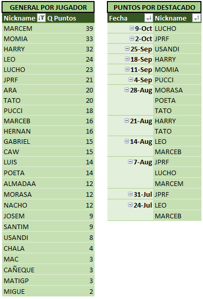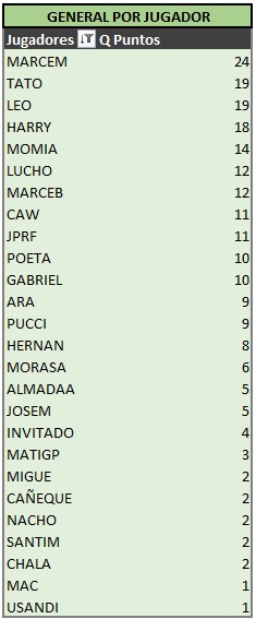 Abajo las tablas actualizadas, donde MARCEM sigue escapándose en la punta y entre TATO y HARRY (gran dupla, por cierto!) ya lo están apretando a LEO.