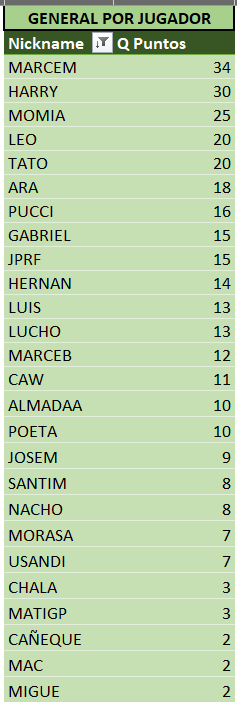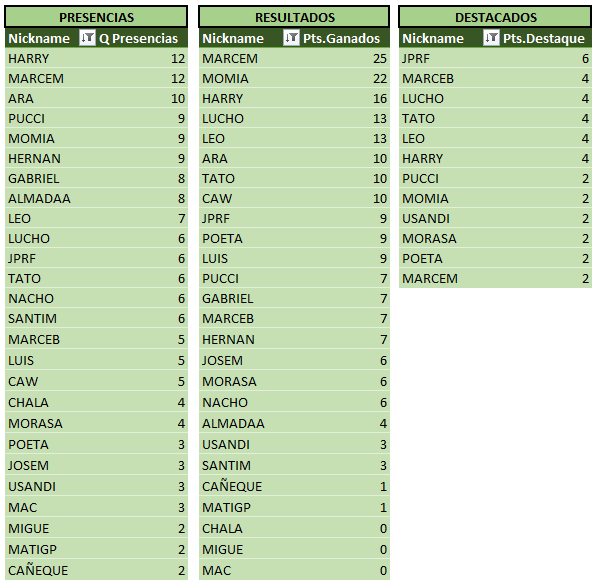 Sin más que reiterar que algo hay que hacer para frenar a MARCEM… asistencia perfecta (junto a Harry) y siempre en la punta, a continuación las tablas actualizadas!!